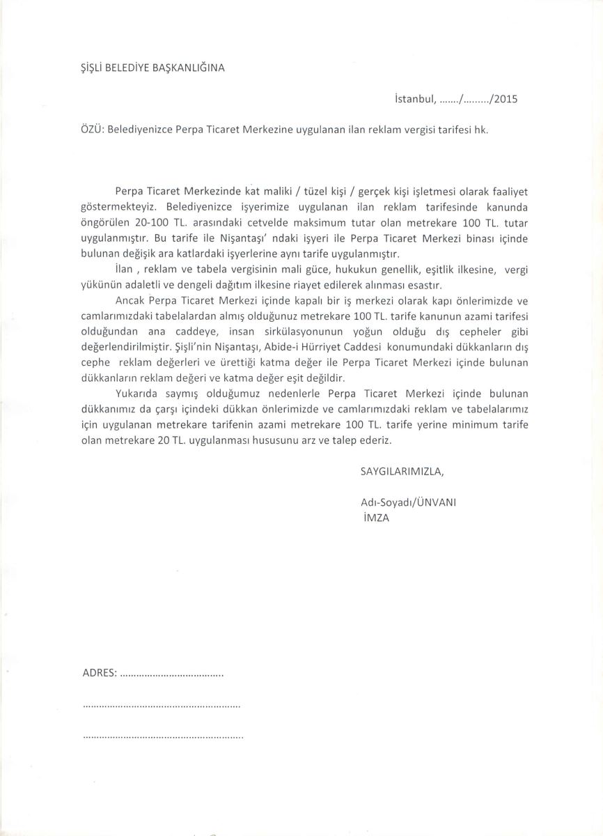 Bu yıl içerisinde Şişli Belediye Başkanlığınca Perpa Ticaret Merkezi içinde bulunan işyerlerine uygulanan metrekare 100 TL. azami ilan reklam tabela vergisi ile ciddi ekonomik rakamlar içeren vergilerle karşılaşmış bulunmaktasınız.
